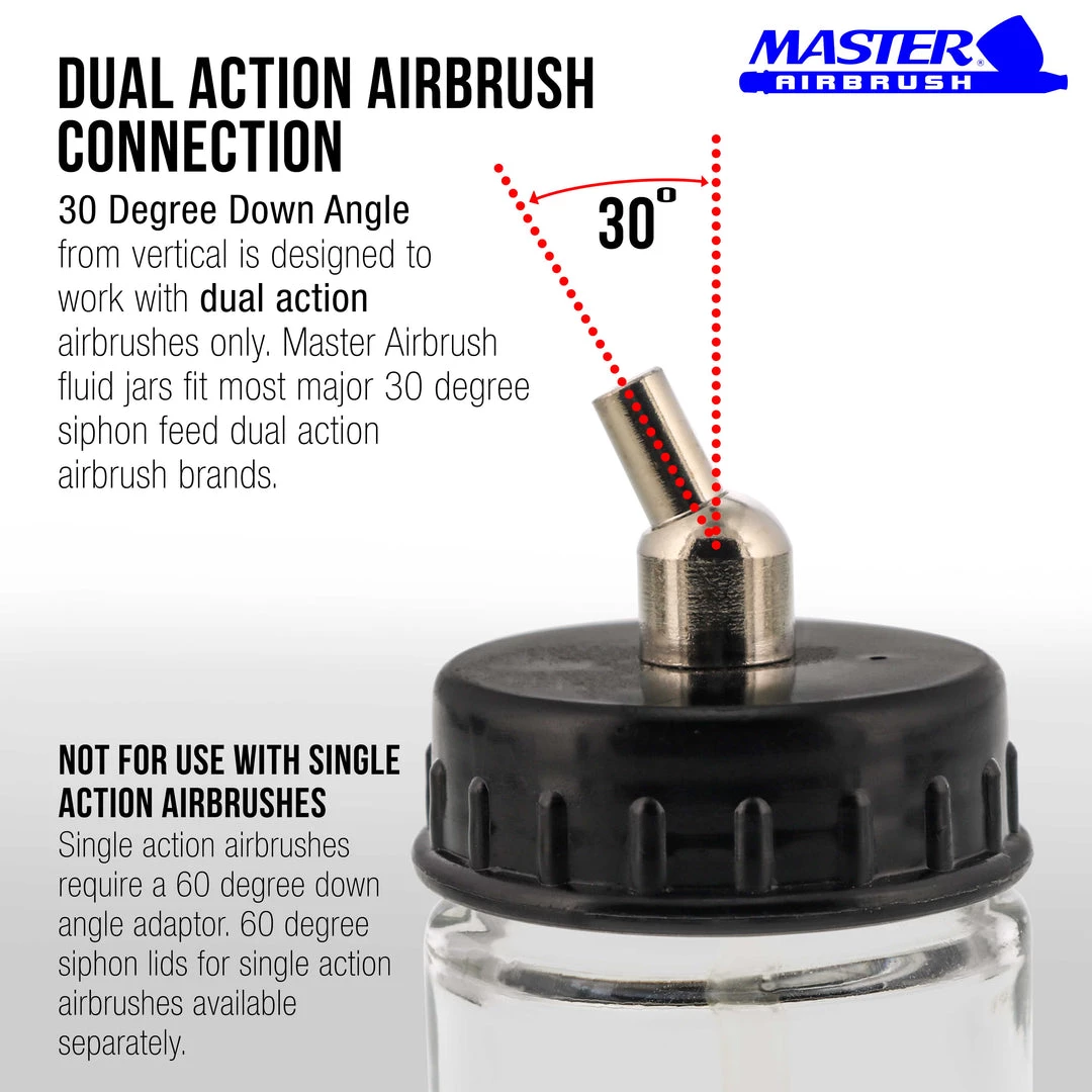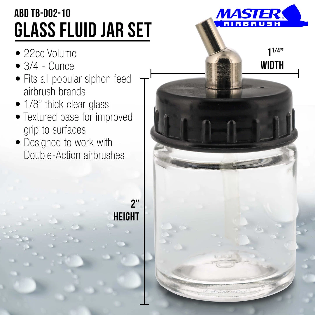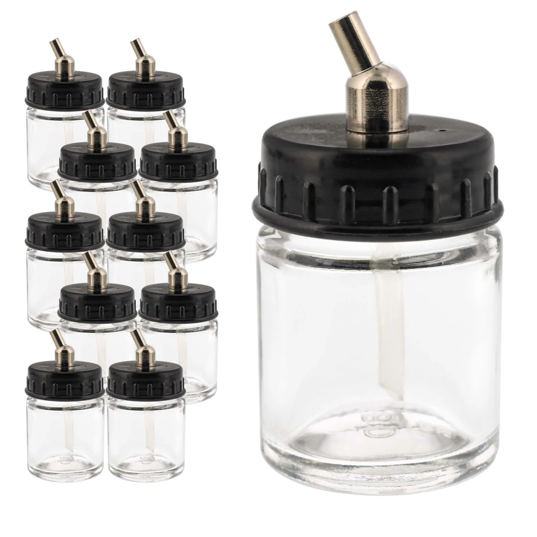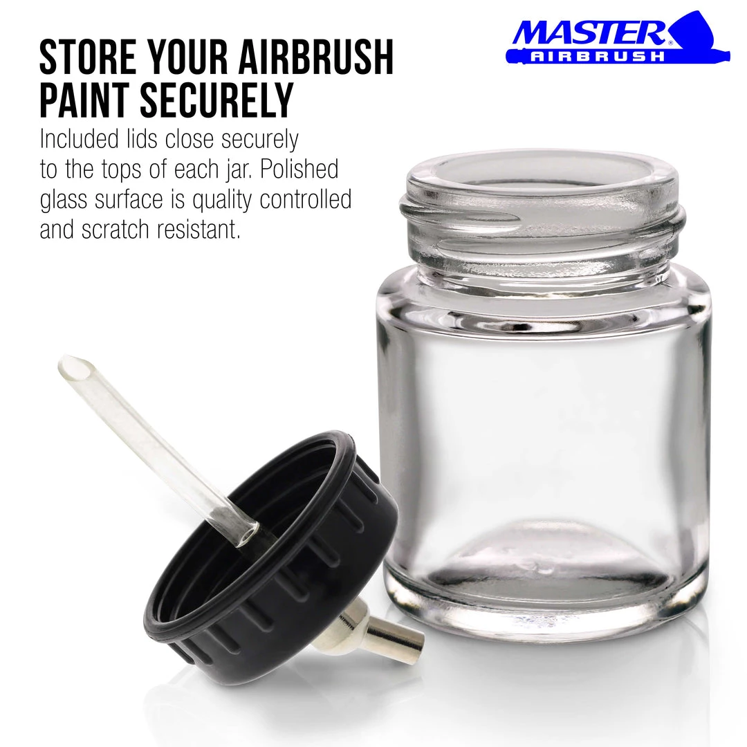 10 Pack of Master Airbrush TB-002 3/4 oz Glass Jar Bottles with 30 degree Down Angle Adaptor Lid Assembly – Dual-Action Siphon