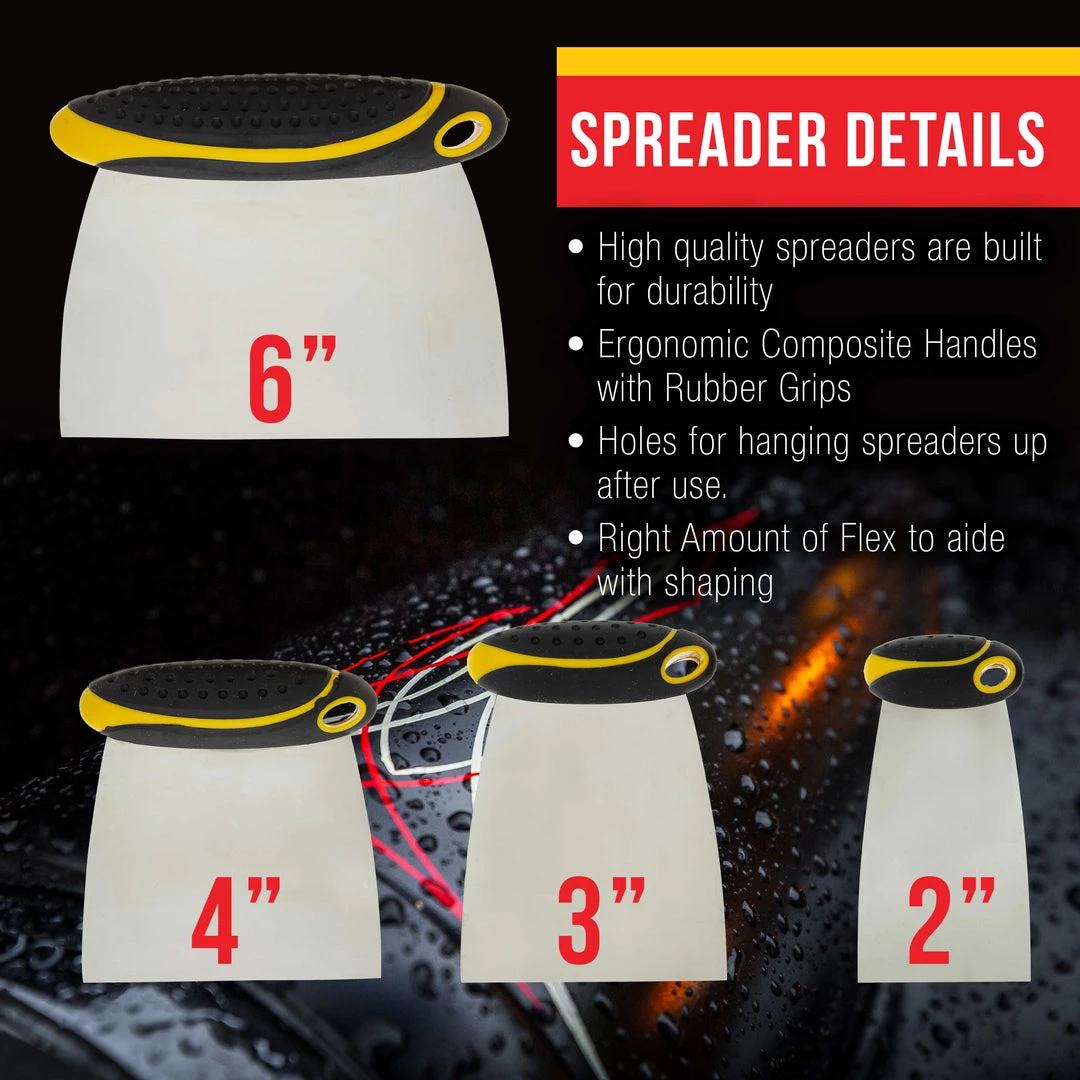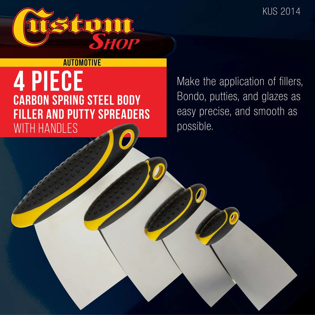 Be the first to review “Custom Shop Body Filler Tools 4-Piece Set Of Carbon Spring Steel Body Filler And Putty Spreaders/Scraper Set With Handles (2″, 3″, 4″ , 6″)” Cancel reply