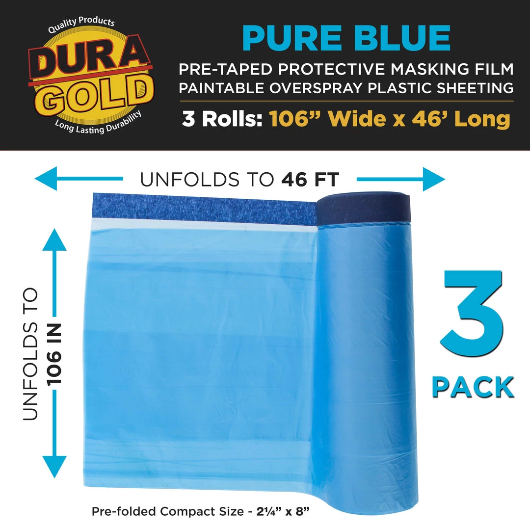 106″ Wide x 46′ Long Roll of Pure Blue Pre-Taped Masking Film, 3 Pack, Overspray Paintable Plastic Protective Sheeting, Pull Down Drop Sheet