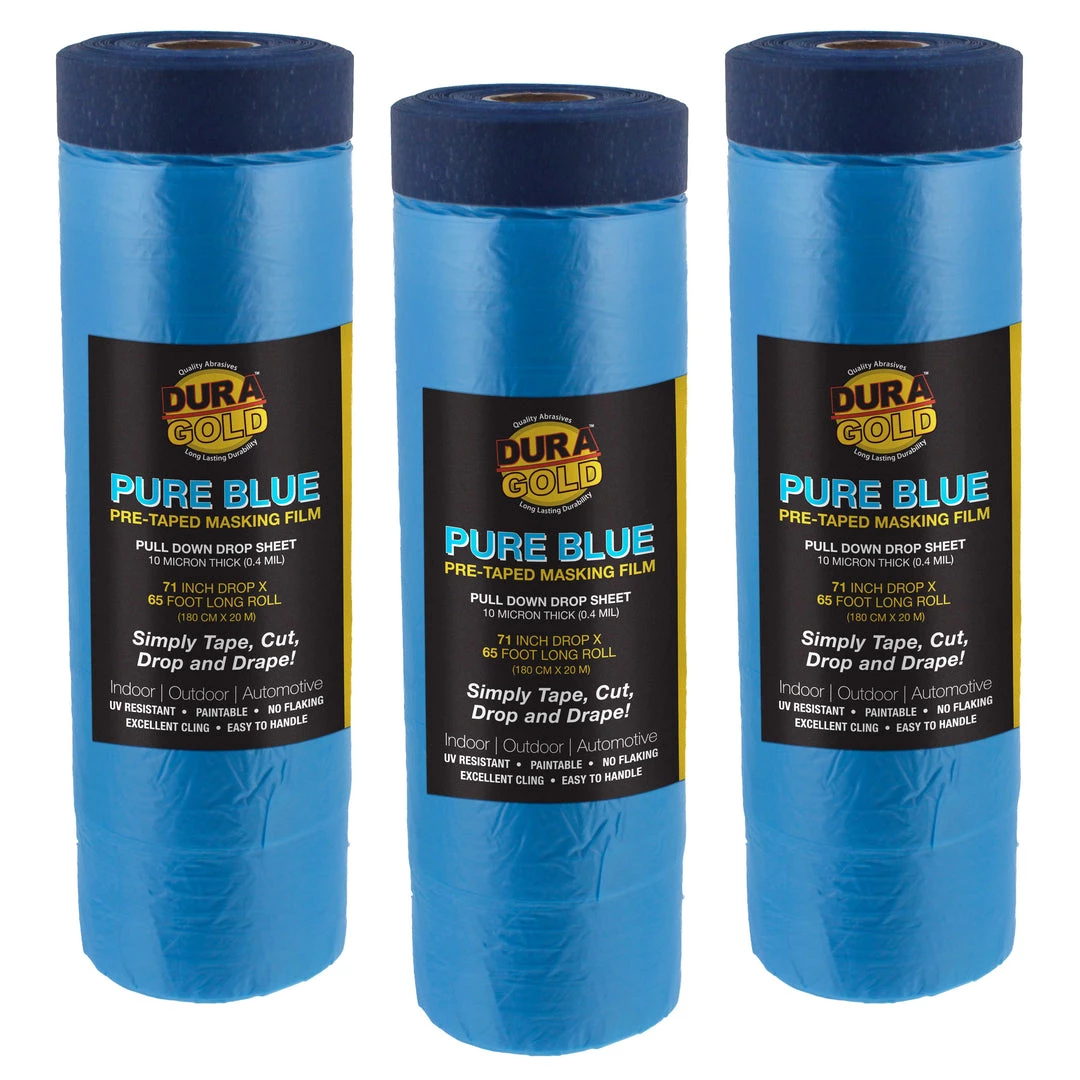 71″ Wide x 65′ Long Roll of Pure Blue Pre-Taped Masking Film, 3 Pack – Overspray Paintable Plastic Protective Sheeting, Pull Down Drop Sheet
