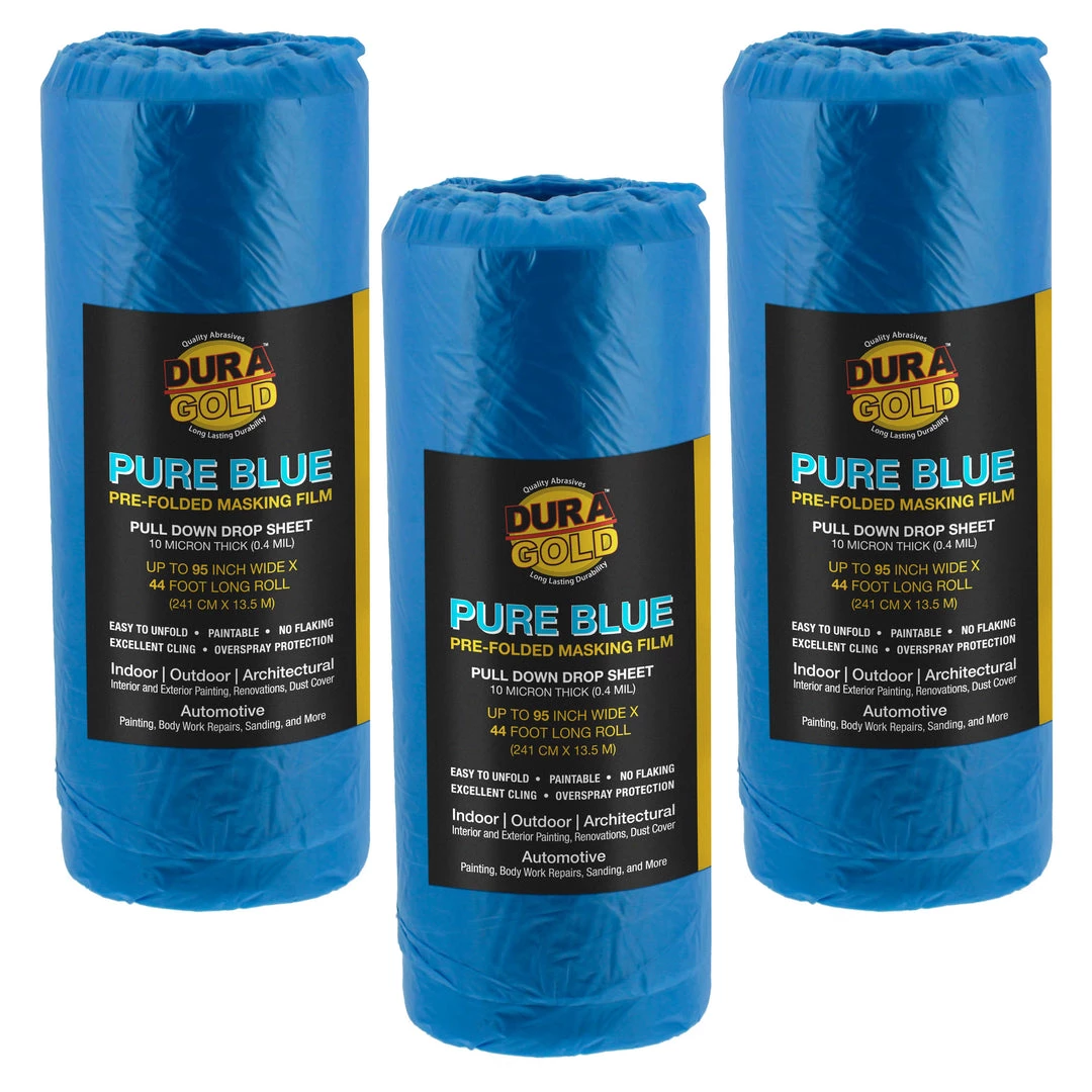 95″ Wide x 44′ Long Roll of Pure Blue Pre-Folded Masking Film, 3 Pack – Overspray Paintable Plastic Protective Sheeting, Pull Down Drop Sheet