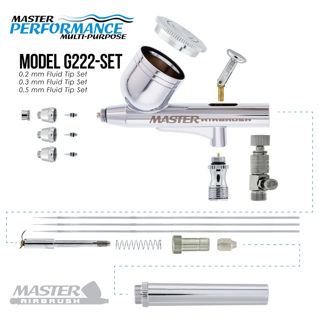 G222 Pro Set Master Airbrush with 3 Nozzle Sets (0.2, 0.3 & 0.5mm Needles, Fluid Tips and Air Caps) – Dual-Action Gravity Feed Airbrush, 1/3 oz. Cup