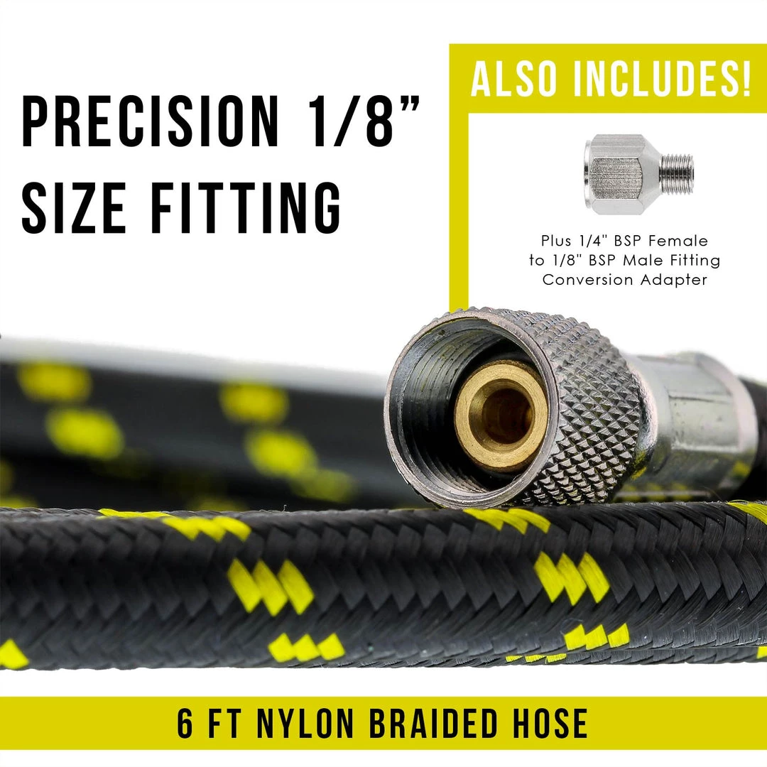 Premium 6 Foot Nylon Braided Airbrush Hose with 1/8″ BSP Size Fittings plus a 1/4″ BSP Female to 1/8″ BSP Male Fitting Conversion Adapter