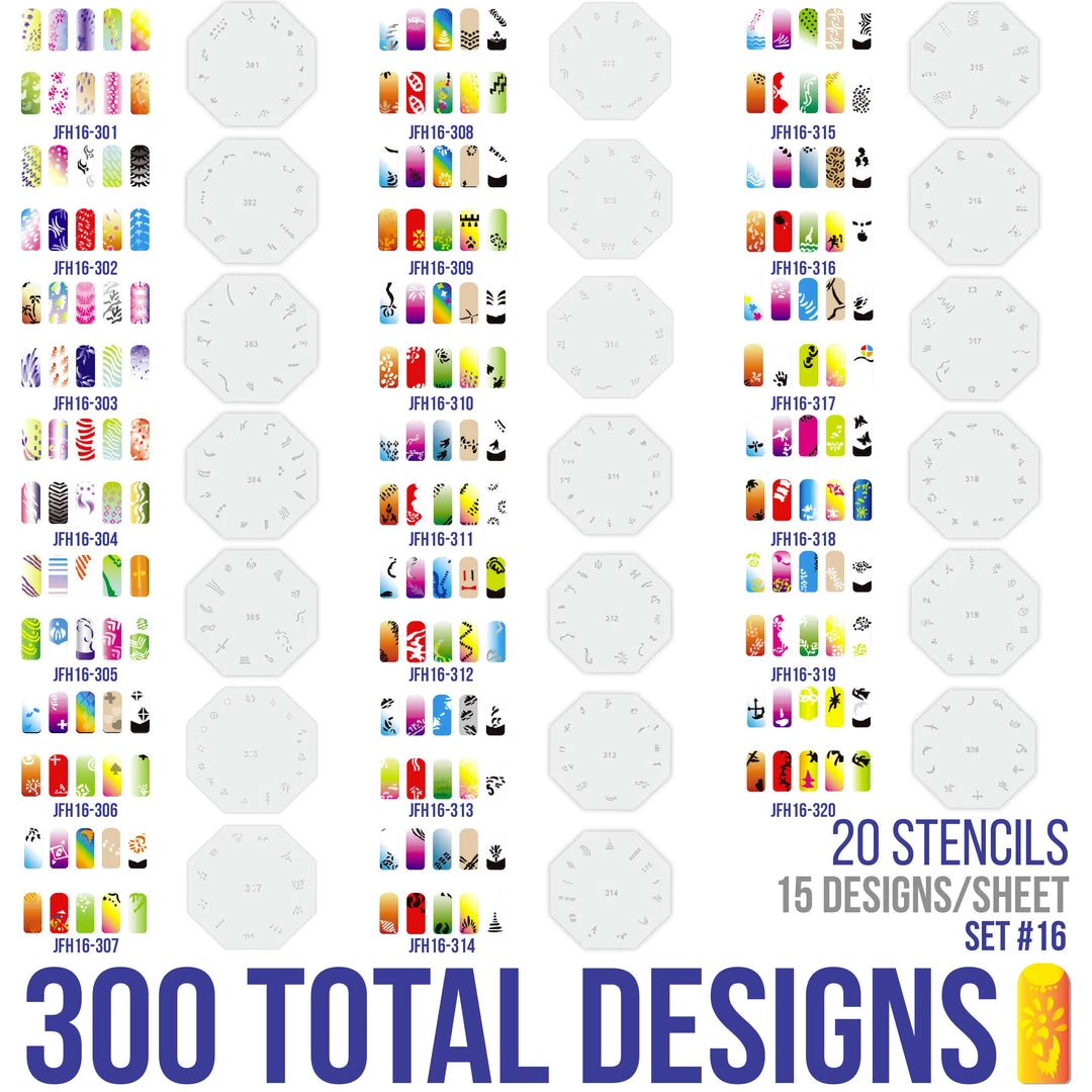 Airbrush Nail Stencils – Design Series Set # 16 Includes 20 Individual Nail Templates with 13 Designs each for a total of 260 Designs of Series #16