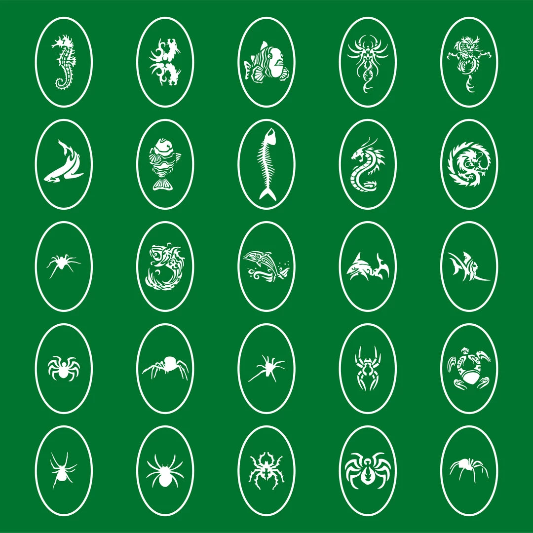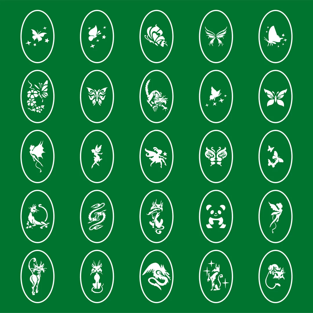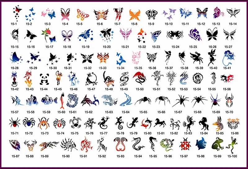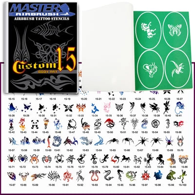 Temporary Tattoo Stencils Booklet Set 15 with 100 Different Self-Adhesive Reusable Stencil Designs