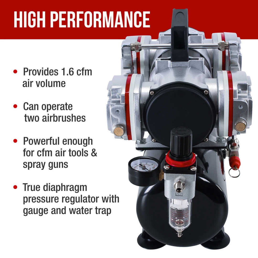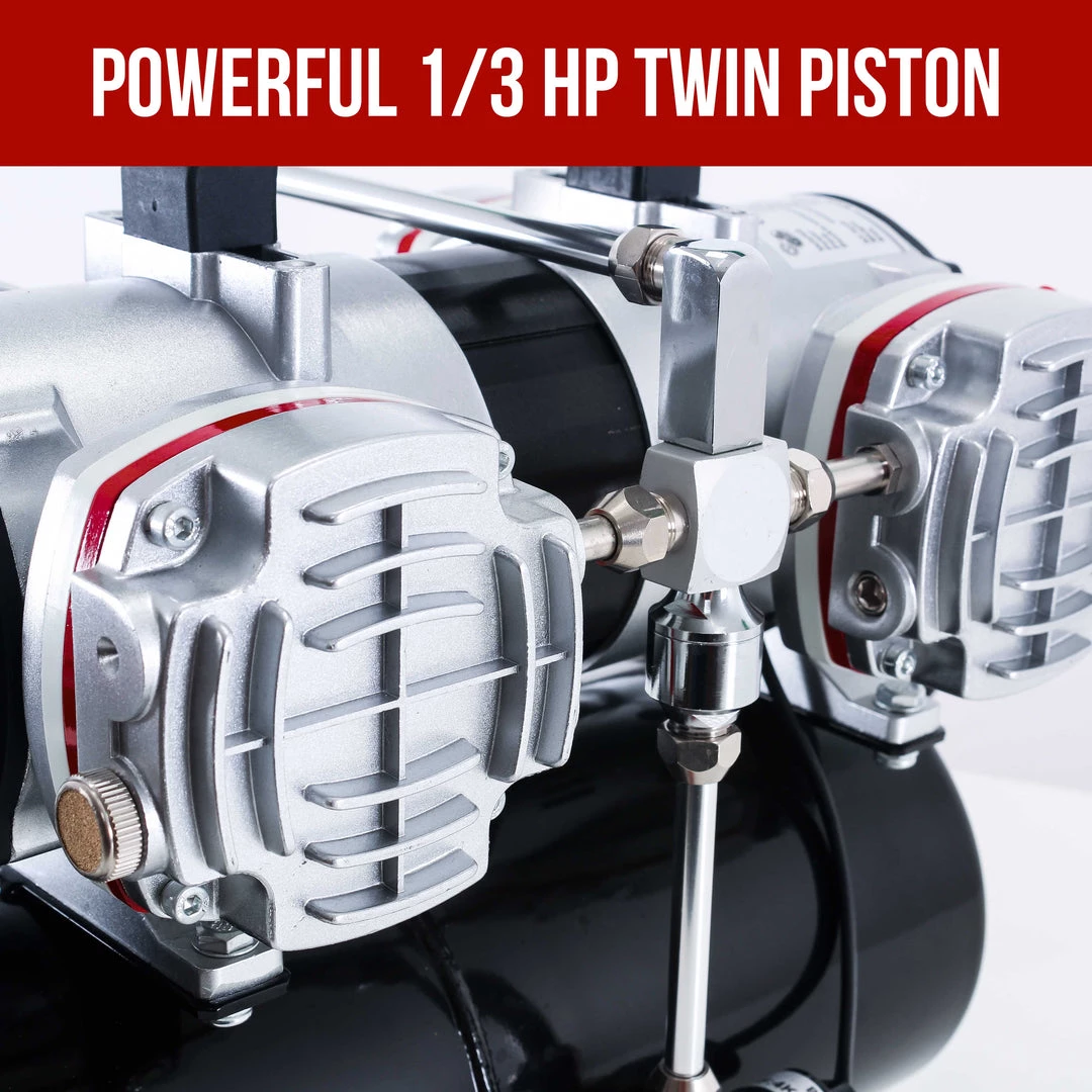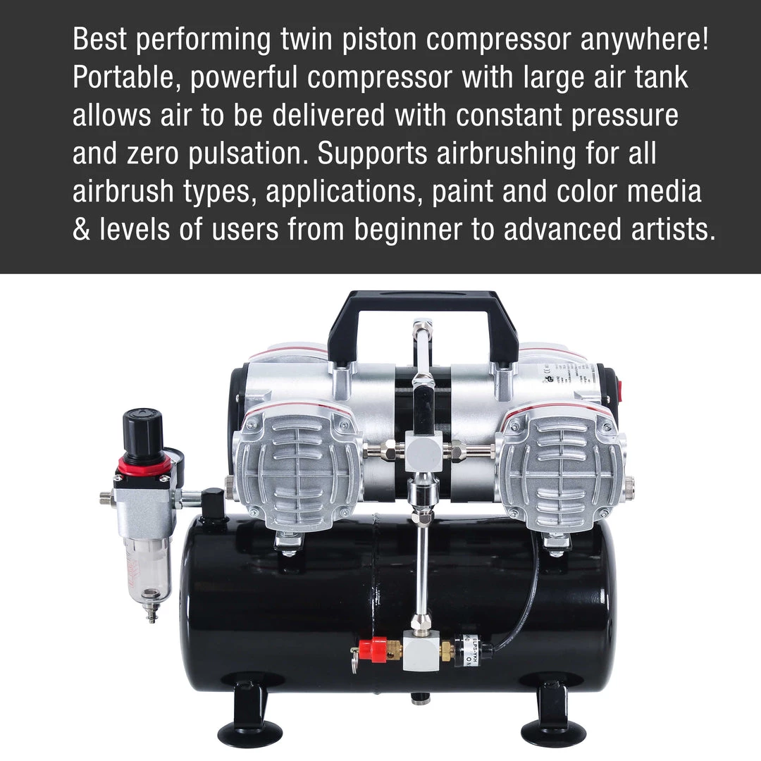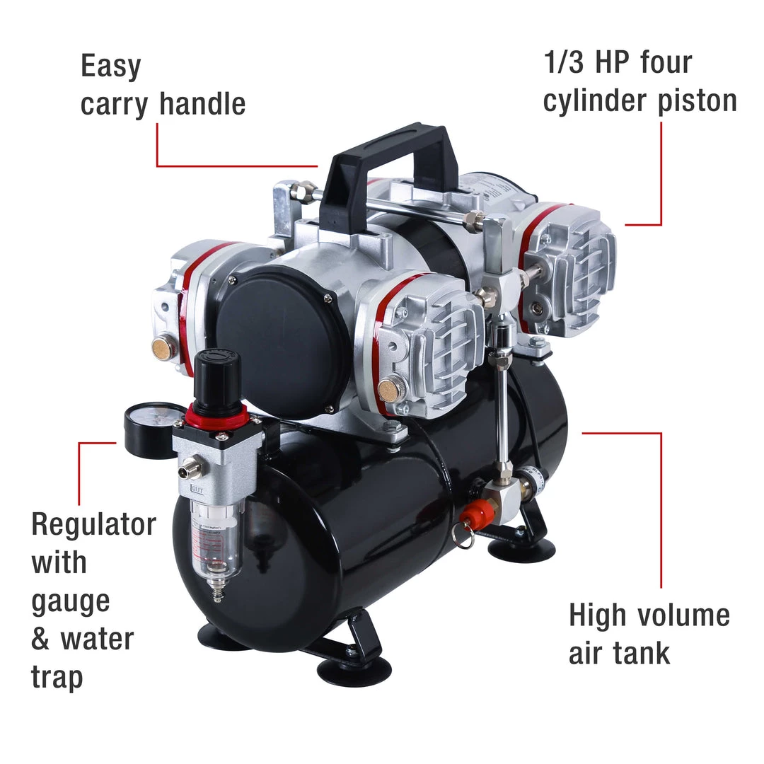 Professional High Performance 4 Cylinder Piston Airbrush Air Compressor with Air Storage Tank, Regulator, Gauge & Water Trap Filter