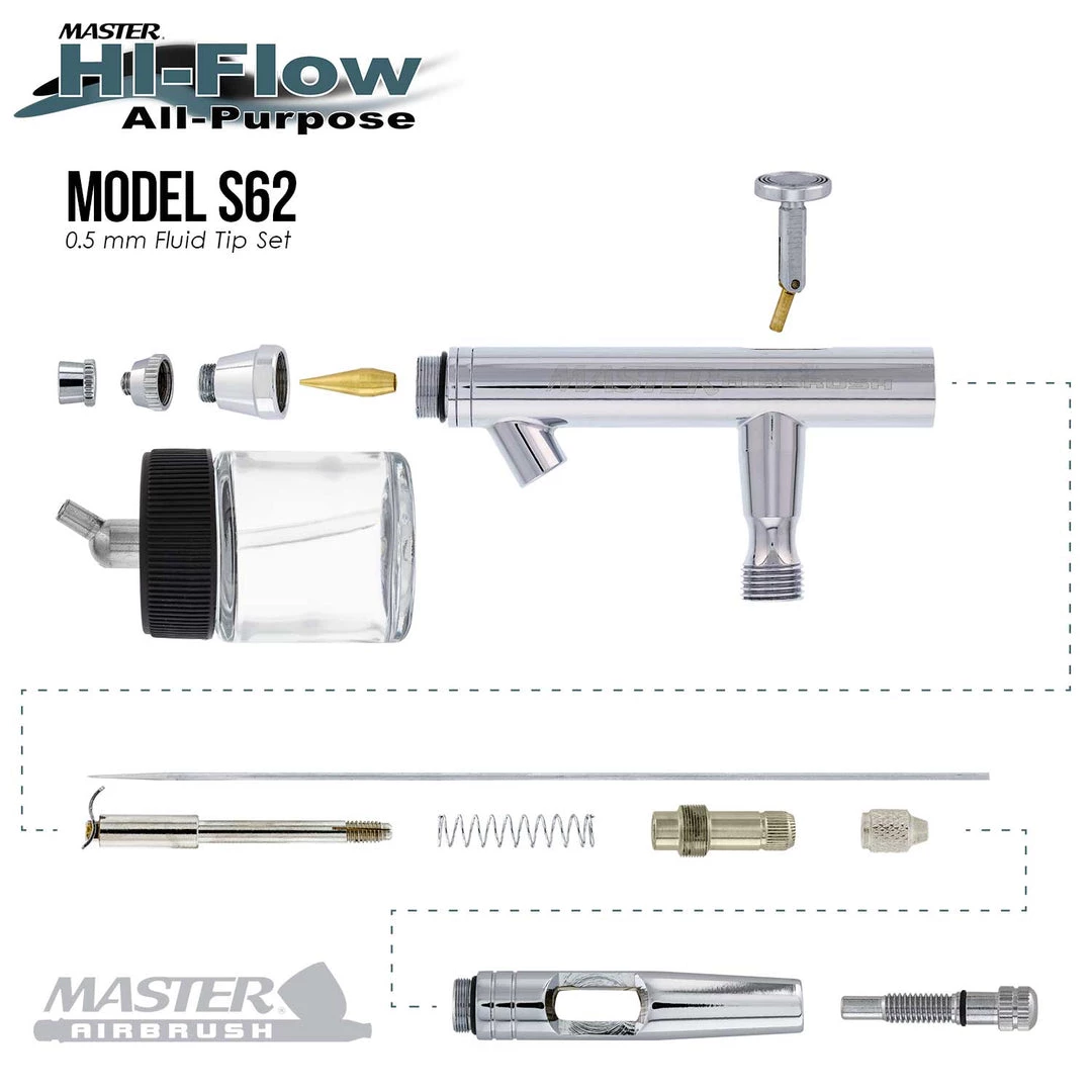 Master Hi-Flow S62 All-Purpose Precision Dual-Action Siphon Feed Airbrush, 0.5 mm Tip, 3/4 oz Bottle