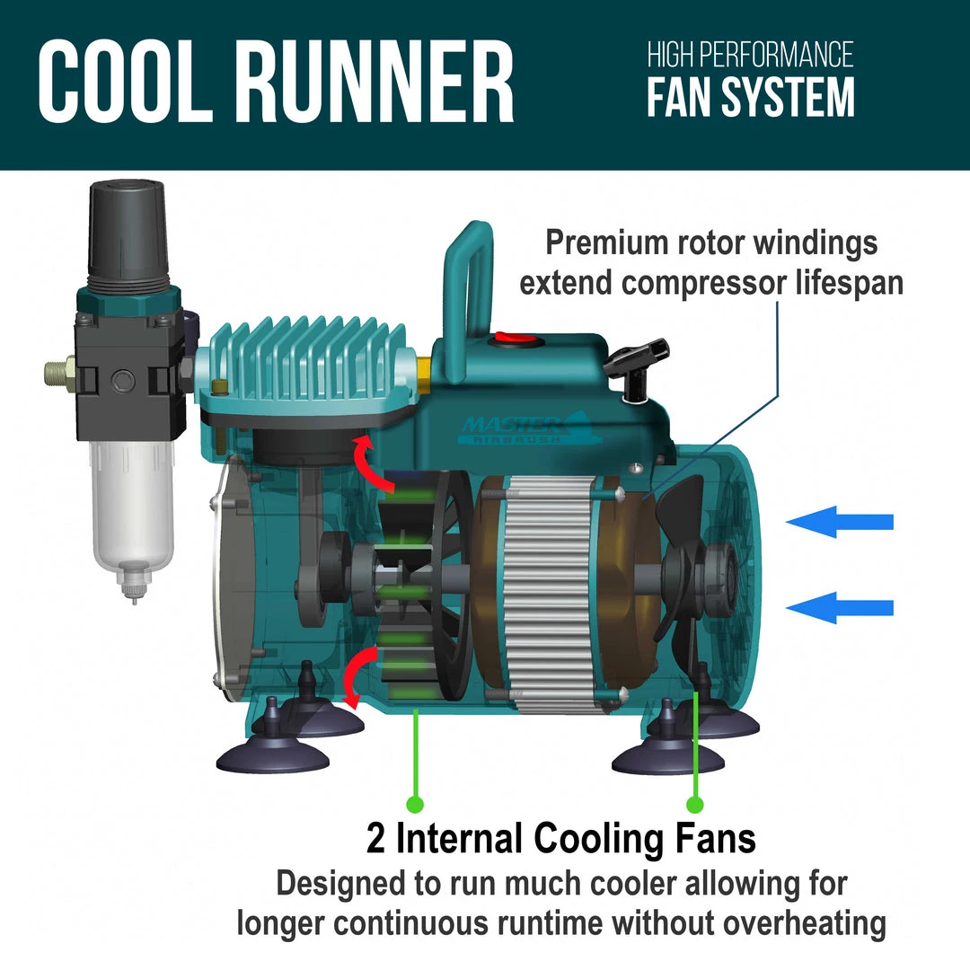 TC-40 – Cool Runner Professional High Performance Single-Piston Airbrush Air Compressor with 2 Holders, Regulator, Gauge, Water Trap Filter & Air Hose