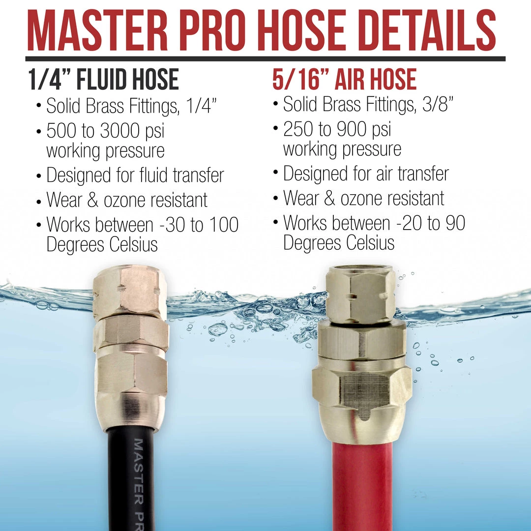 Master Pro Series 25 Foot Air and Fluid Hose Assembly Set with 3/8″ NPS Air and 1/4″ NPS Fluid Fittings for Spray Guns, Paint Pressure Pot Tanks, HD