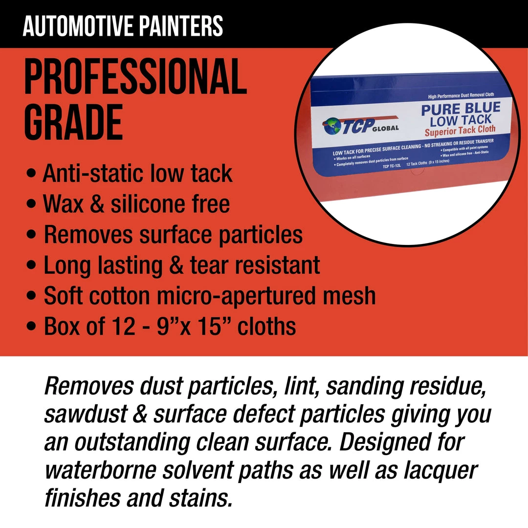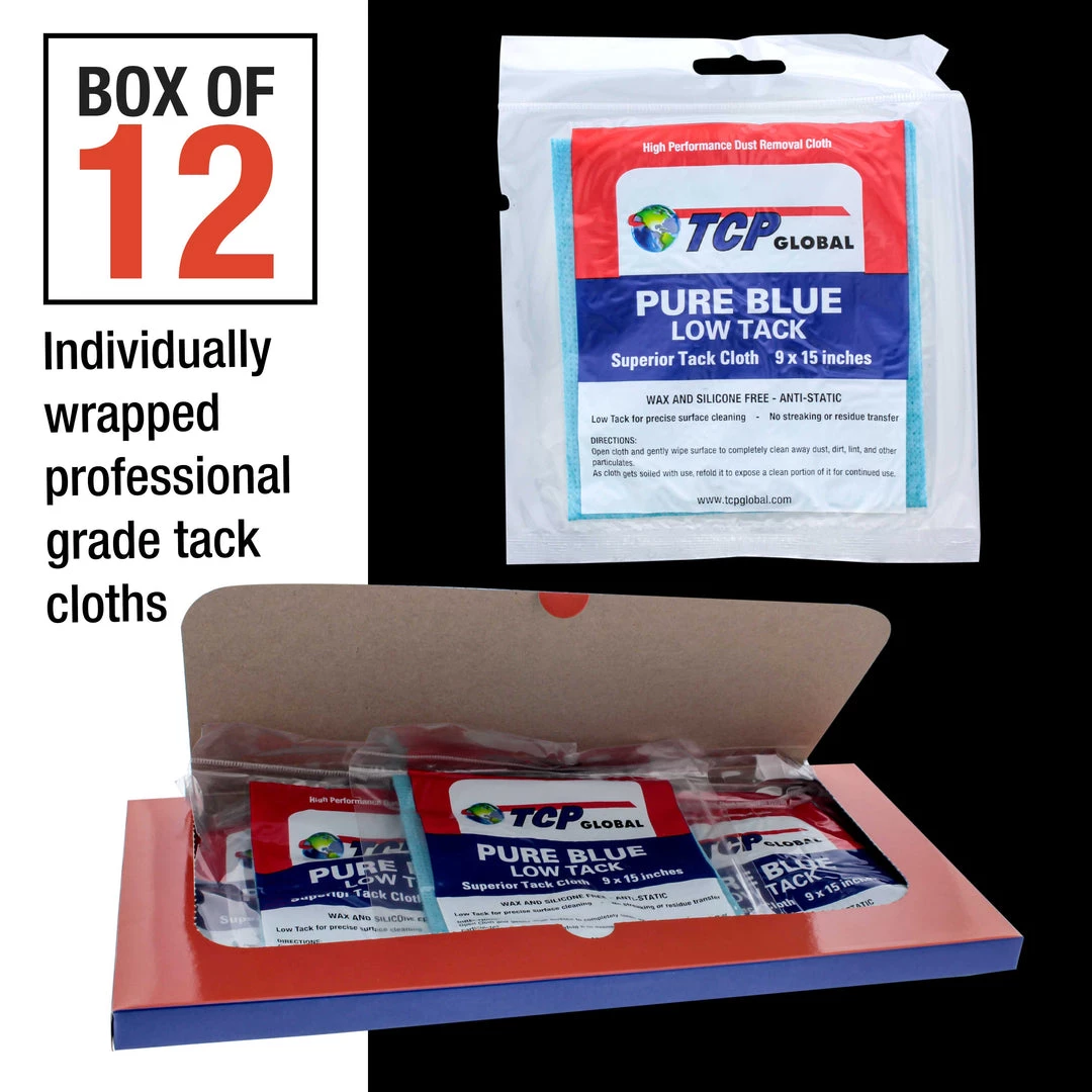 TCP Global – Pure Blue Low Tack Superior Tack Cloths – Tack Rags (Box of 12), Automotive Car Painters, Removes Dust Sanding Particles, Cleans Surfaces